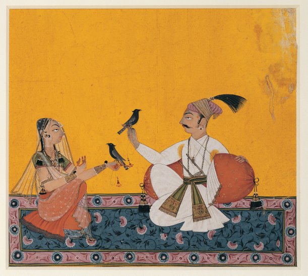 The rise of the Mughal Empire (1526-1858 CE) called for the subjugation of numerous small states that had existed in India before the sixteenth century. Some of these principalities were already Muslim, while others, like those ruled by the warrior Rajput caste in northern India, belonged to a native Hindu heritage. Situated at the foothills of the Himalayas, the Rajputs’ were known for their military might, but even they, like many other indigenous groups in India, eventually faced Mughal domination. The Rajputs came to an agreement with the Mughal conquerors; the Mughals would allow them to rule their individual territories in exchange for their participation in Mughal military campaigns and their sending of an important member of their family to be raised at the Mughal court. In spite of their military talents, the Rajputs also cultivated the arts, producing distinctive painting styles, one of which included a bright yellow colour…